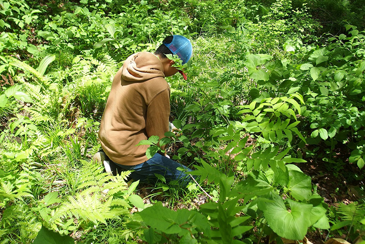 整備された森では、たくさんの山菜が見つかります。サンショウの花とキノコの炒め物。森からの恵みに感謝して、「いただきます!」。