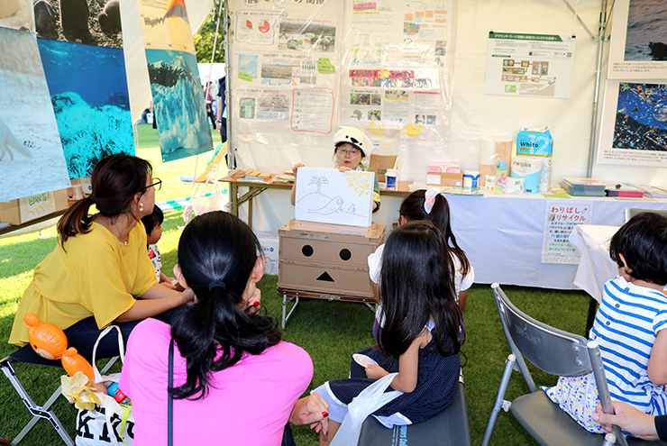 海に流れたプラスチックはどうなるのか、子供たちに伝わりやすいよう「プラ太郎・プラ子の旅」という紙芝居にし、マイクロプラスチックや海洋ごみの問題について伝え、魚や動物を守る方法を一緒に考えました。 2020年10月