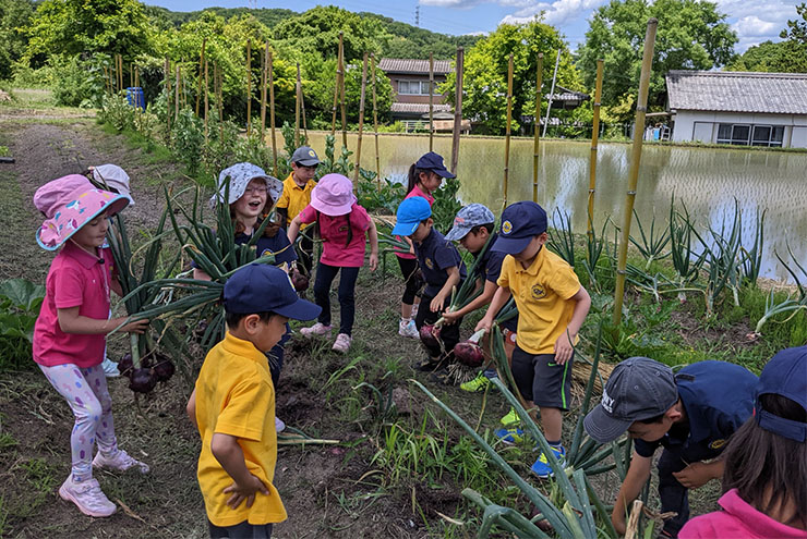 ドイツ学院インターナショナル5、6歳児15名が参加してのSDGs校外学習。無農薬・化学肥料無しで育てたタマネギを収穫。初めは少し恐る恐るでしたが、子供たちは土にまみれて夢中になって沢山収穫できました!