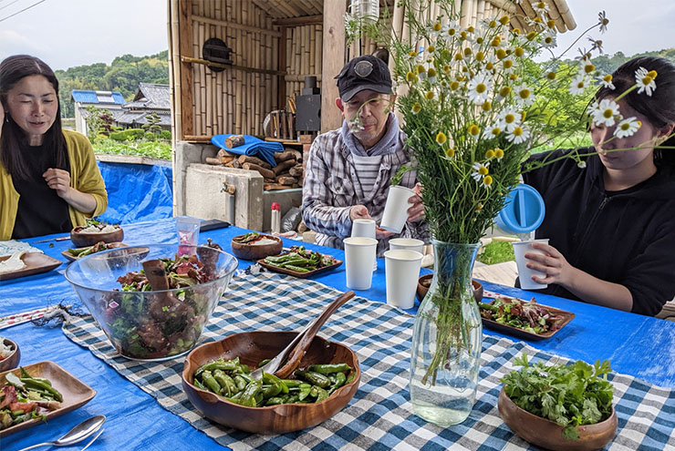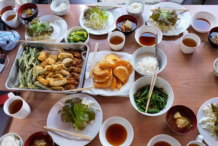 この時季になると、のまはら農園の食事は肉と調味料以外はほぼ自給となります。その日に収穫出来る野菜をみんなで調理して美味しくいただきます。