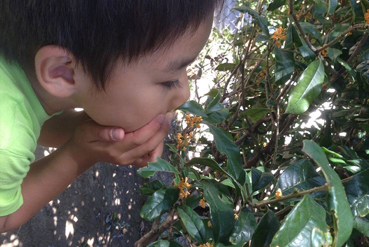 いろんな草や花の香をかいでみました。キンモクセイは特に人気で、「いいにおい~!」という声がたくさん聞こえてきました。目や手だけでなく、五感を使って新しい発見ができました。