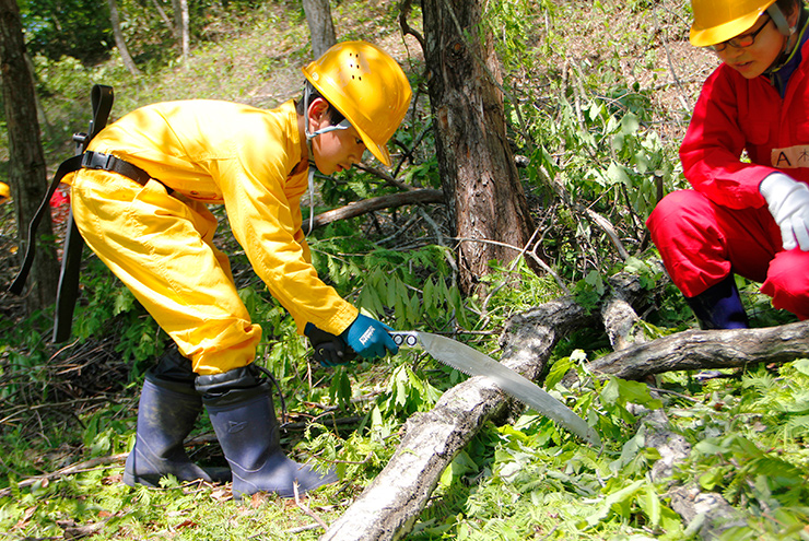 裏山の木を切り出し地域通貨で支払う芸北せどやま再生事業を体験する「せどやま教室」で、コナラの木を小学生が規格に切り出しました。木の堅さや手触りなども体感しています。