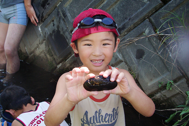 川のいきものの生態や生息環境を専門家と一緒に学ぶ観察会の中で、町の天然記念物であるカワシンジュガイを見つけました!カワシンジュガイと他のいきものとの関わりなども、フィールドで遊びながら学びます。