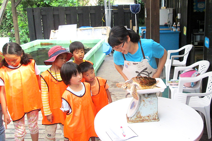 一年間飼育して、大きくなってから放流するプロジェクトを実施しています。1歳の子ガメは、生まれたときと比べて約50倍の重さになっていました!