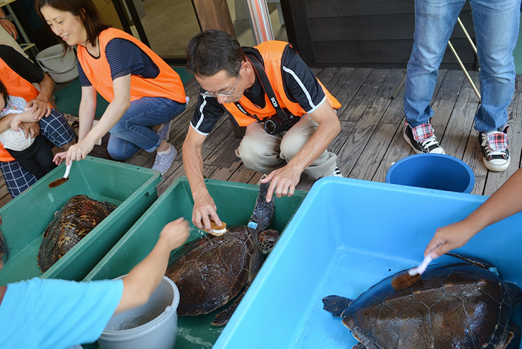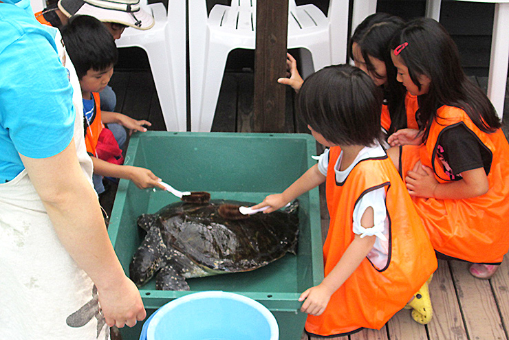 水槽の中にいる間に甲羅についてしまったコケを洗い落とします。甲羅をタワシで洗いながら、ウミガメの特徴を観察します。甲羅は固いけど、手足は結構柔らかいんですよ。
