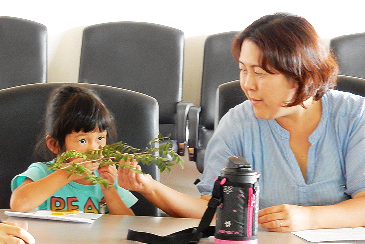 国の天然記念物オオサンショウウオの観察会では、事前学習をします。名前の由来といわれるサンショウの木の匂いを嗅いで、確かめました。その後、川でオオサンショウウオなどのいきものの観察をしました。