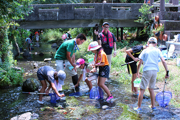 市民の努力によってドブ川から清流によみがえった源兵衛川で生き物探しを行いました。絶滅危惧種のホトケドジョウやサワガニなどを観察し、富士山からのきれいな湧き水によって作り出された生態系の豊かさを学びました。