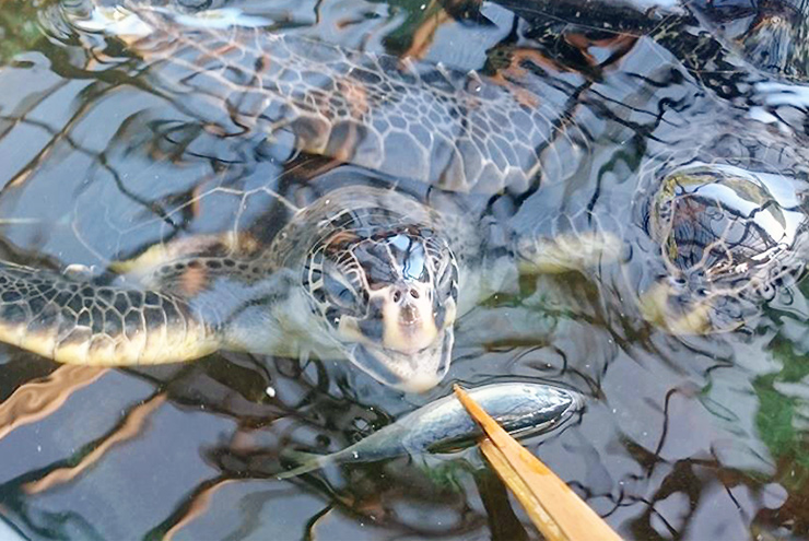 保護水槽の中でのんびり過ごしていたアオウミガメの甲羅にはコケがびっしり!タワシでこすってキレイにします。美しい甲羅の模様が見えるようになりました。