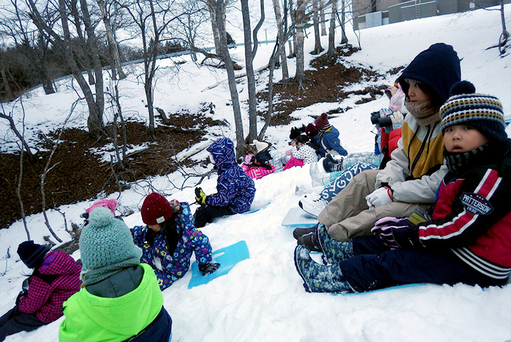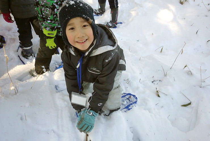 この季節にはめずらしい大雪に子どもたちは大はしゃぎ!普段歩いている森でも、雪が積もると景色は一変!わくわくいっぱいの森の中を、スノーシューを履いてどんどん進んでいきます。