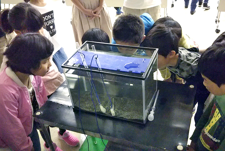 きれいな海に生息する小さな甲殻類「ウミホタル」の発光実験会を行いました。水の中に電気を通すとそれに反応して青い光を発します。初めて見るその光に子供達も歓声を上げていました。