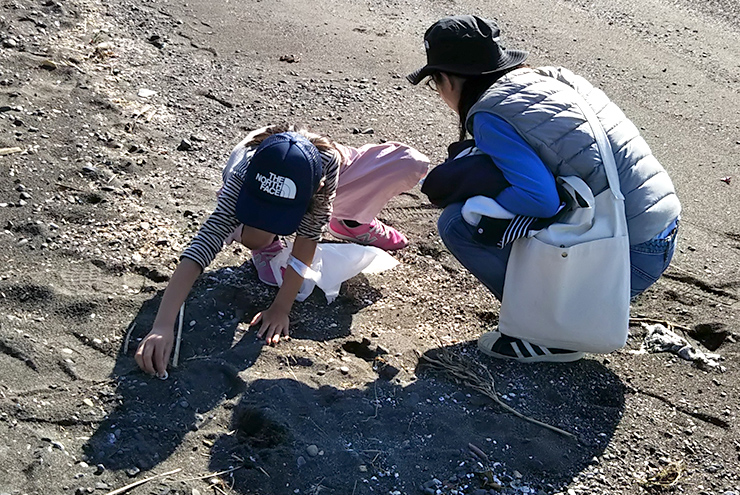 とても天気が良い11月の土曜日。清水区三保の浜辺でビーチコーミングを行いました。小さな貝がらやビーチグラスなど、皆さん思い思いの物を拾っていました。