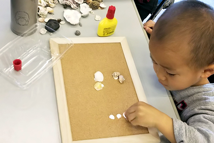 お子さんが、一つ一つ手に取り色や形を確かめながら、自分だけの作品を創るのに熱中されている様子がわかります。子どもの時代の自然体験/自然の見方が成長した時の行動に良い影響を及ぼすそうです。たくさんの機会をこれからも提供してほしいと思います。