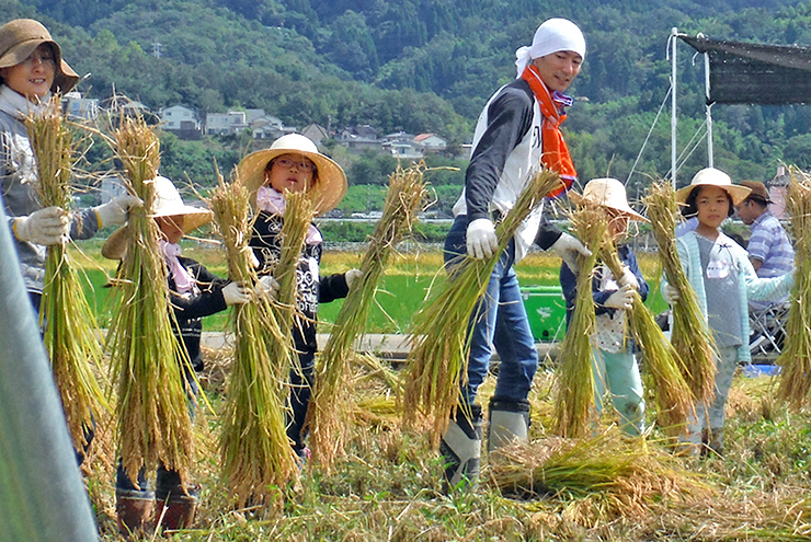 みんなで作ってきた田んぼの稲刈り。刈り取って束ねたらハサ掛けするのですが、今年は手渡しでハサ掛けまで運びました。田んぼがだんだん片付いてきれいにハサ掛けされていき、終わった後は達成感がありました。