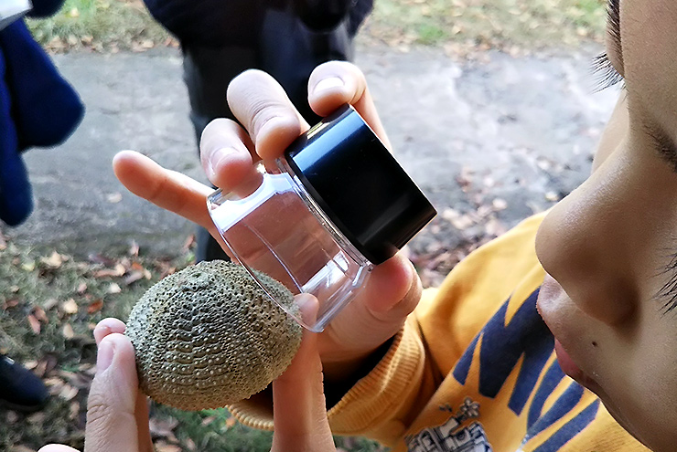 ウニは死ぬと棘が取れて丸坊主の状態になります。時々、海岸に落ちていますがウニの殻だとわかる人は稀です。この男の子は初めて見るウニの殻に興味津々で観察していました。