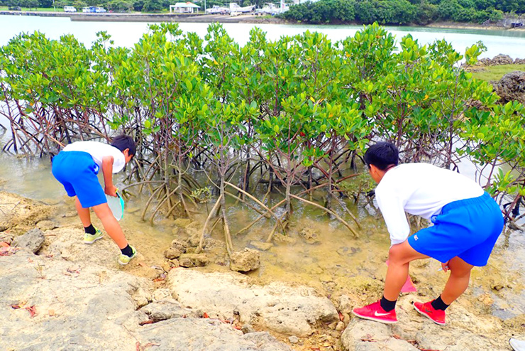 中学校の地域の環境を学ぶ環境学習プログラムにおいて、地元のマングローブ域にいる生きものを観察しました。生徒たちは真剣に生きものを探していました。