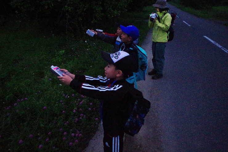 夜の酪農地帯を歩きながら、コウモリを探します。コウモリは超音波を発してエサとなる虫を探すため、超音波が人の耳に聞こえるようになるバッドディテクターを使いながら、みんなで協力してコウモリを探しました!