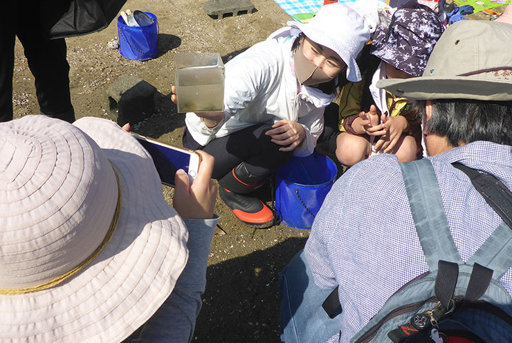 和白干潟で、アサリの生態や、干潟・生物の説明、潮干狩りのコツなどをレクチャーして、安全に潮干狩りや生きもの探しを楽しんでいただきました。