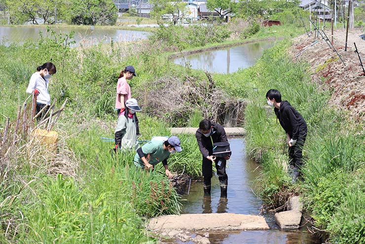 普段管理している田畑周辺の川を調査。源流に近いこともあって水は綺麗です。事業第1回目の調査でみんな夢中になって活動しました。