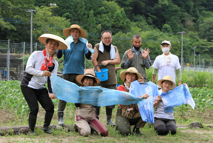 今年は藍を育てて、夏に生の葉を使い田んぼで絞り染めをしました。藍の葉と水だけがあれば染まる不思議に大人も夢中になりました!