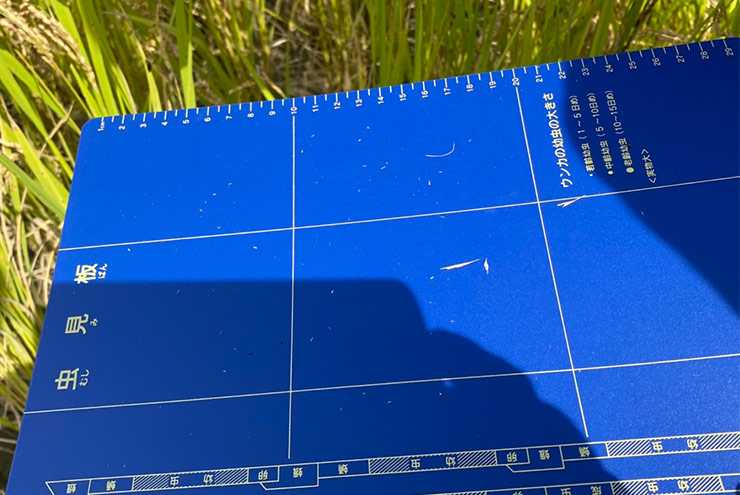 田んぼの稲刈りの日、“虫見版”を使って小さな虫を観察しました。稲穂の下あたりに虫見版を置いて稲穂をゆすると、ほこりの様なものが虫見版に落ちてきます。それをよく観察してみると、小さな虫が・・・
