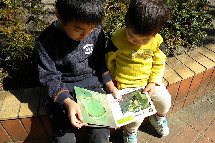 生き物に関する本を子どもたちへ貸し出しました。みんながそれぞれ気になる図鑑や絵本を手に取り、興味津々に読んでいました。中には、兄弟そろって一緒の本を読みお話ししている姿もありました。