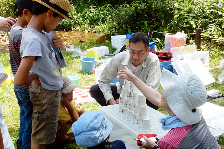 霧ヶ谷湿原での親子観察会では、川に入り水生昆虫を見つけ、分類して名前や特徴を調査します。その後一番印象に残ったいきものをイラストにし、講師がタワーにみたてて、生物多様性のお話をしました。