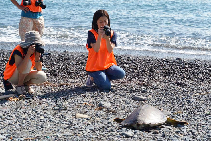 砂浜に放されたアオウミガメは、海に向かって一生懸命進みます。その様子を撮影する、写真教室参加者も真剣!