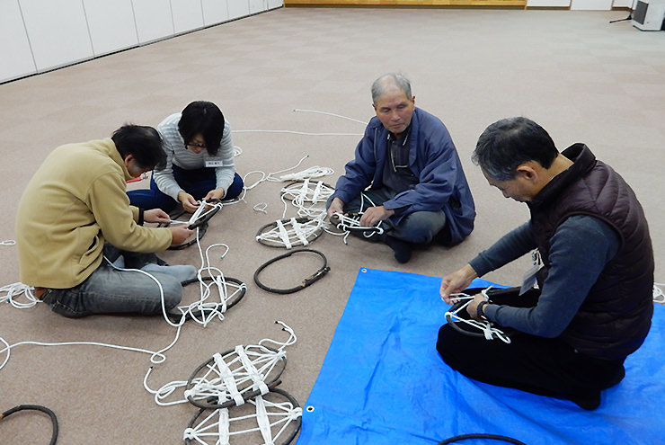 地元のかんじき作りの達人から、冬の必需品「かんじき」の作り方を学びました。ミヤマガマズミを山から採り、湯につけて曲げ枠を作ります。その枠にロープを巻きつけて、雪の上でも歩きやすいかんじきができました。