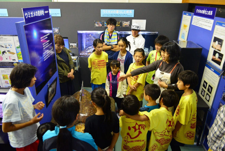 大人のアカウミガメの剥製を見学しました。この大きさになるには早くても30年かかります。放流するウミガメは2歳くらいなので、卵を産みに帰ってくる頃には皆さんも大人になっていますね。