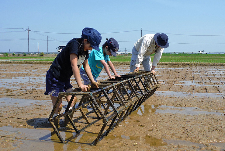 田植えの前に”田ころがし”をころがして、苗を植える目印をつけます。曲がったり、先につけた印とずれたりしないよう、慎重にころがします。昔ながらのやり方を学んで、伝えていきます。