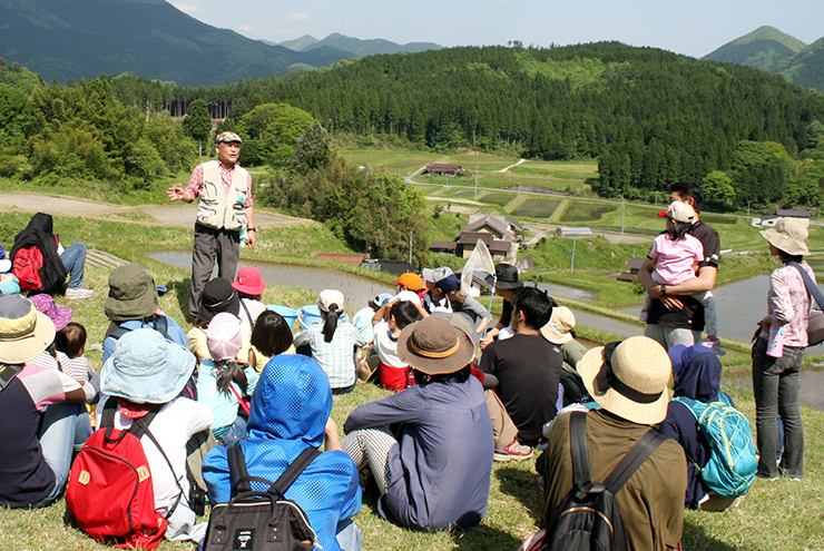 山里の棚田を訪ね、田んぼに棲む生き物を親子で観察しました。水田の生き物に詳しい先生から、生き物から見た水田の環境について話を聞きました。