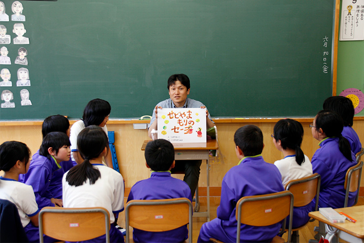 芸北せどやま再生事業について、わかりやすく伝えるためにオリジナルの紙芝居を作成し、子どもたちに読むことで森や生き物のことを知ってもらいます。