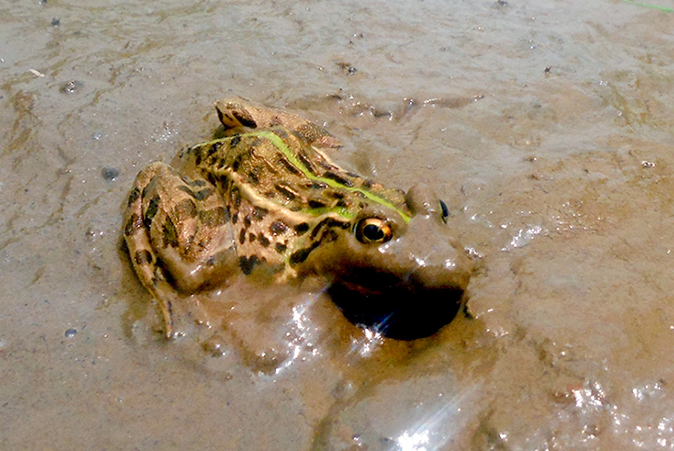 活動している田んぼのあぜ道を歩いていると、草むらからトノサマガエルが出てきて、田んぼの泥の中に跳びこんでいきました。カエルがたくさんいられる田んぼを守るため、農薬を使わずにみんなの力で米作りをしています。