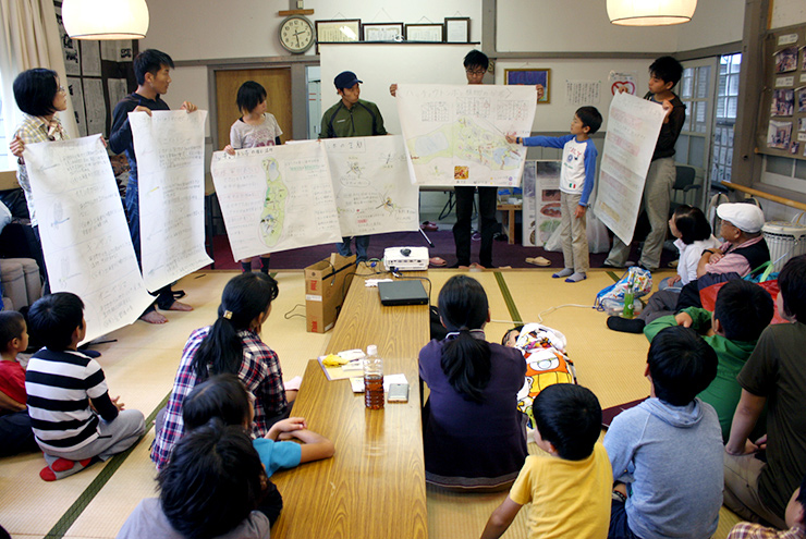 中国山地に残る古い木造校舎をつかって、子どもたちの環境学習発表会を行いました。トンボビオトープでのハッチョウトンボの調査報告なども専門家や友だちの前で行いました。
