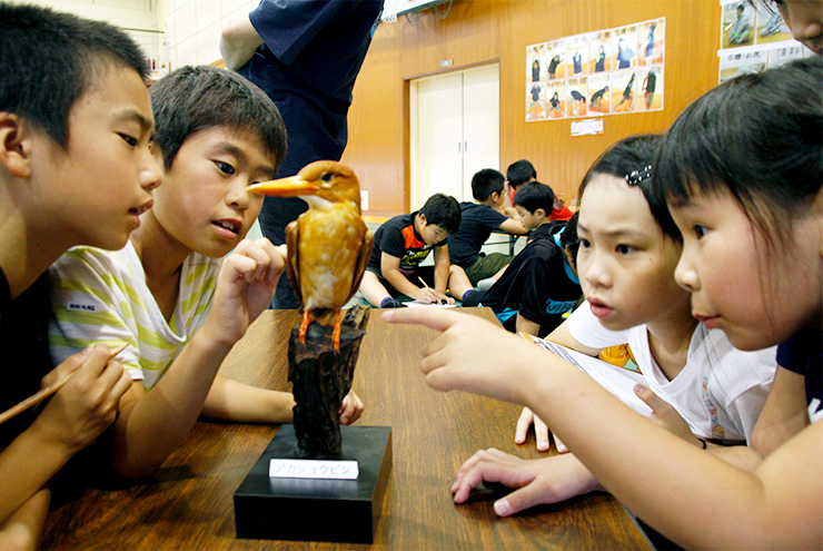 夏休みに実施した森や山の大切さを学ぶ「山の学校」で、ブナ林に生息するアカショウビンの剥製を観察し、特徴などを発表しました。