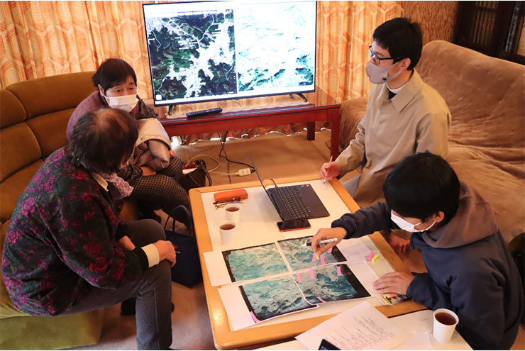 地域で暮らす80歳代のお2人をお招きして、50年前の航空写真と今の写真とを比較しながら農業用の用排水路の変化、農法の変化、田畑、山林、人口や町、地域文化の変化など様々なことをお伺いし貴重なお話を聴かせていただき記録いたしました。