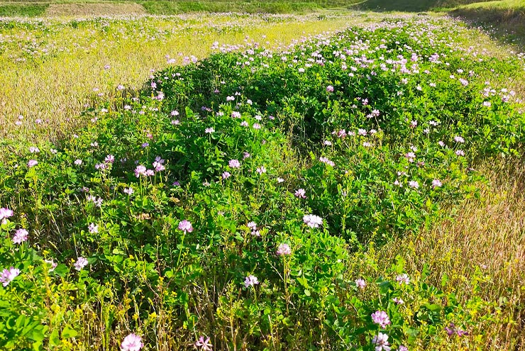 地域の高齢者のお話では昔の水田は春にレンゲソウが咲いていて綺麗だったそうです。再現を試みて昨年種まきした水田のレンゲソウが開花しました。今年は化成肥料無しで水稲の生育を調査します。