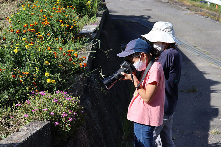 先生にカメラの使い方を丁寧に教えてもらったので、(はじめは恐る恐る、でも)自信をもって一眼レフカメラを使えました。お花や昆虫、生きものを捕まえたドロドロのお顔を撮影しあいました。
