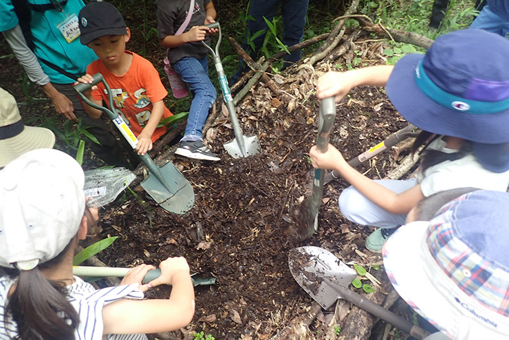 地元の農家さんによる堆肥作りにならって、分解を進めるために中身の落ち葉をひっくり返して、空気を入れています。葉っぱの中には、白い菌糸がびっしりとついたものもあって、分解の始まりを見ることができました。