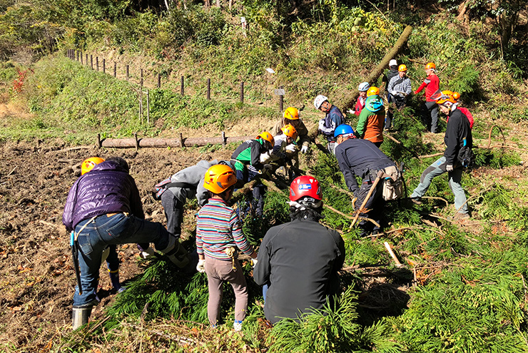 チーム総出の伐採作業ですね。間伐することで林の中に日差しが入りこむようになり、生き物の新たな生息空間が生まれます。希少植物カタクリなどが代表例です。