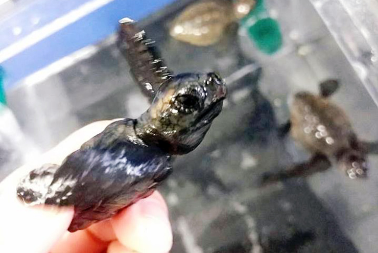 人工孵化の子ガメの一部を水槽で飼育しています。1年ほど飼育し、体が大きくなってから海へと放流します。体が大きくなれば生き残る可能性も高くなります。体の中に個体識別用のマイクロチップを入れています。