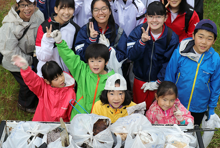 富士山麓のごみひろいを実施。一見きれいな森に見えても、よくよく見てみると色んな所に行き場所なくしたごみたちが隠されていました。活動終了の頃には、みんなの軍手も真っ黒に!