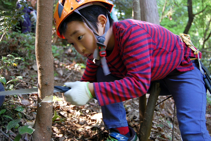 初めてののこぎりは少し大変だったけれど、一生懸命に取り組み、すぐに慣れて上手に受け口をつくれました。