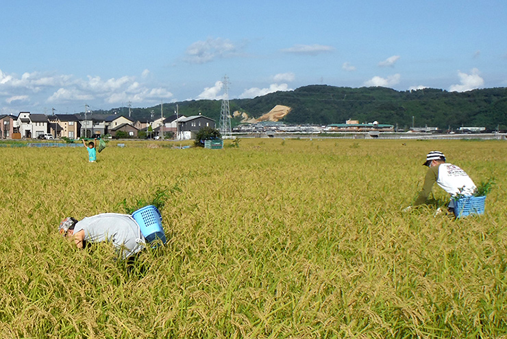 稲刈り前にボランティアの方と一緒にヒエやクサネムなど、お米に混ざると困ってしまう雑草を取っています。農地の魅力を伝える場をつくるために、たくさんの人の協力があります。