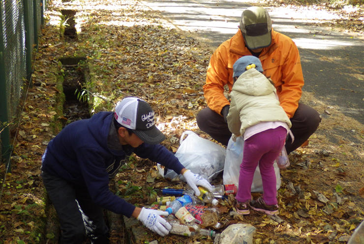 紅葉の中、落ち葉に埋もれてしまう前にごみひろい。活動中には鹿の姿も!きっとありがとうって言いに来てくれたんだね。