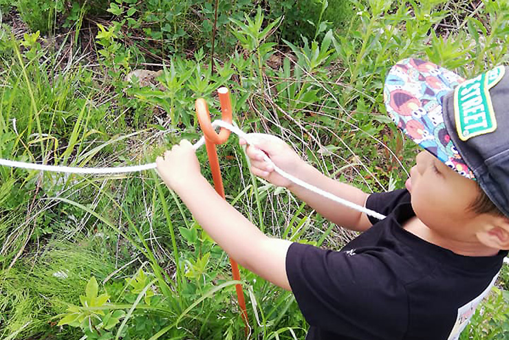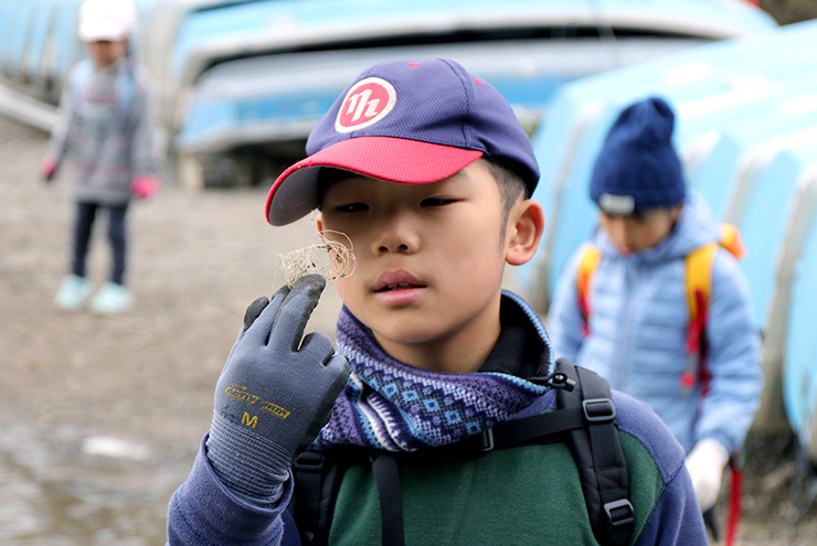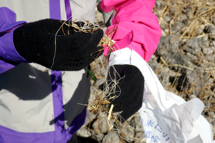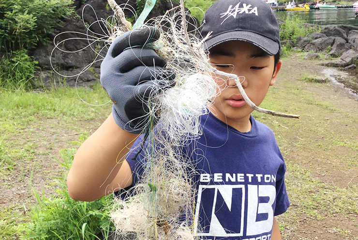 湖で釣りを楽しんだ後、残された釣り糸。こんなに小さなごみが生き物の命を脅かすこともあるんです。みんなで目を凝らして細かく丁寧に回収しました。