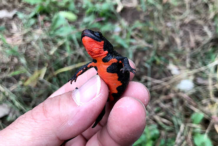 アカハライモリは両生類。日本の固有種です。水田や河川の淀みなど流れのない淡水域に生息しています。環境省レッドリストでも準絶滅危惧種として2006年に記載されました。