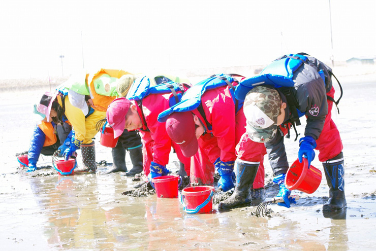 地域の漁業協同組合の皆さんと一緒に、アサリの移植作業のお手伝いをしました。掘ったアサリの中から4cm未満のアサリは、より大きなアサリに成長するように、砂のやわらかい別の浜辺に移殖しました!