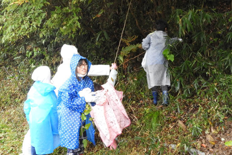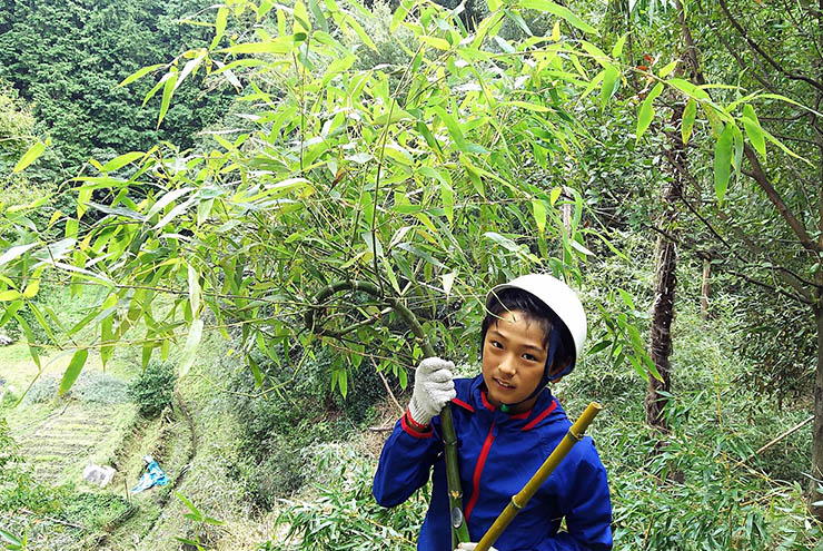 長年手入れしている雑木林に、隣接している竹林から竹が侵入しています。放置するとどんどん広がるため、大人も子供も協力して伐採しました。ちょっと変わった枝ぶりの竹は、子供たちのお気に入りになりました。