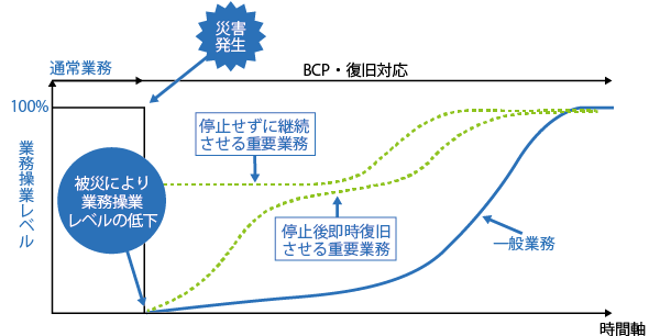 災害の発生により業務の操業レベルが低下した際、社会的責任の観点から、キヤノンMJグループの事業として影響が大きく、早急な復旧が求められる業務については、重要業務として、あらかじめ策定された計画に基づいて「停止せずに継続させる」または「停止後即時復旧させる」などの対応を行います。